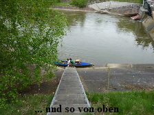 Einsetzstelle los. Auf dem linken Ufer war nach dem Wehr eine Treppe zu sehen. Diese kam uns aber sehr steil vor. Etwas weiter vom Wehr auf der rechten Uferseite sah von Weitem eine